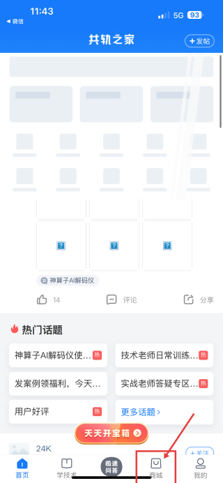1、打开共轨之家APP,点击底部商城选项,进入商城页面。