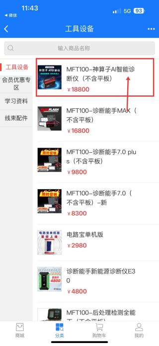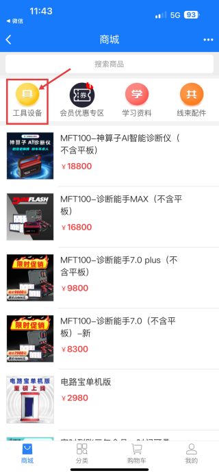 2、在商城页面,点击工具设备分类,进入工具设备商品列表。