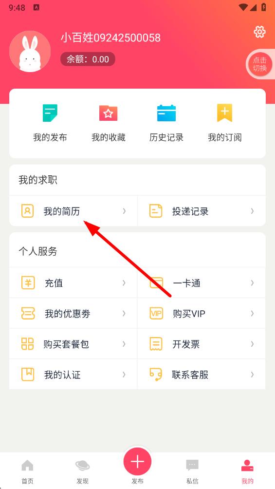 2、在个人页面的我的求职板块中,点击我的简历选项。