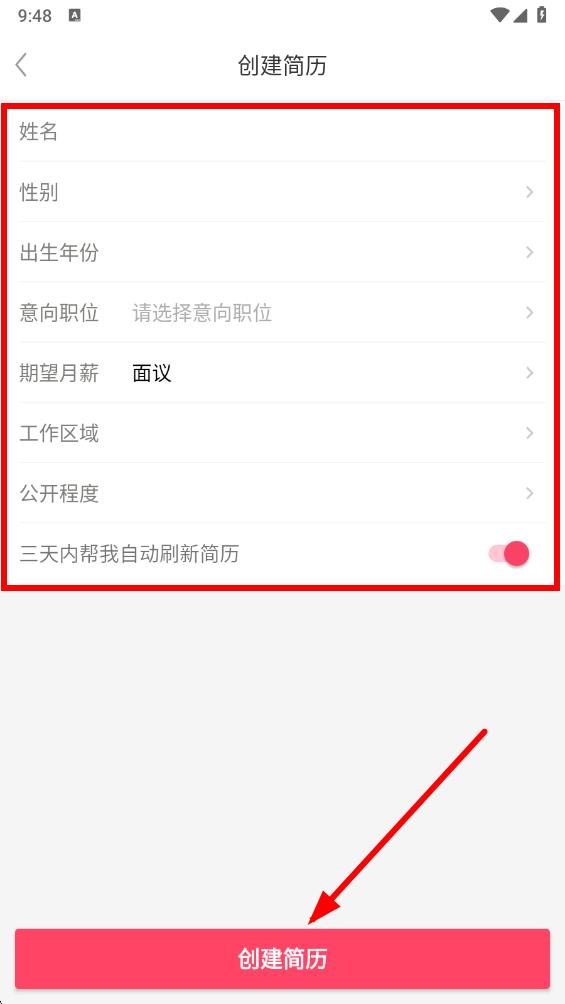 4、在创建简历页面,依次填写姓名、性别、出生年份等相关信息,确认信息无误后,点击创建简历按钮,即可完成简历信息的创建。