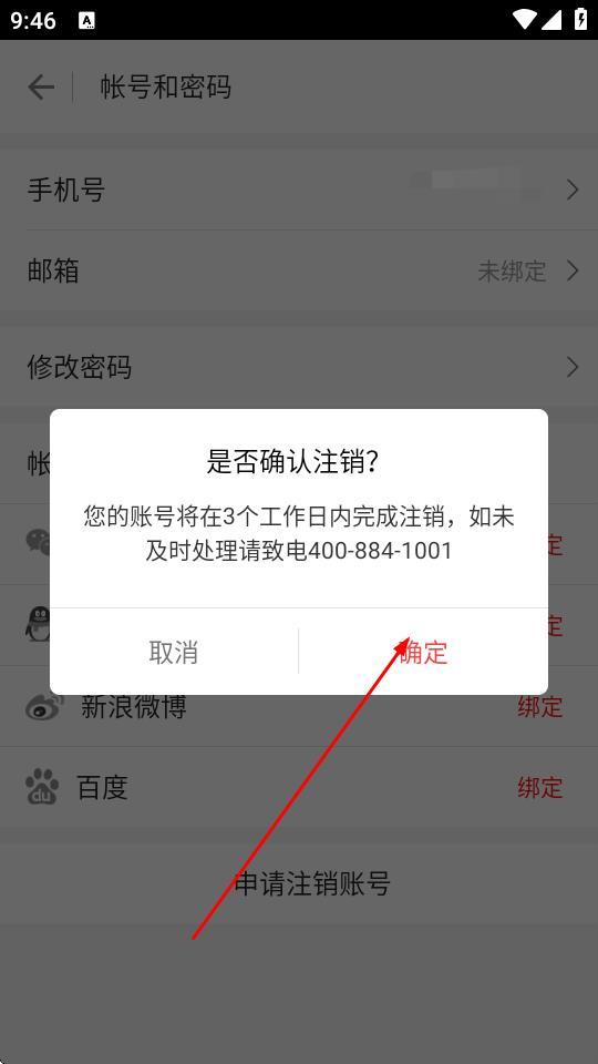 5、在弹出的确认窗口中,点击确定,即可申请注销账号。