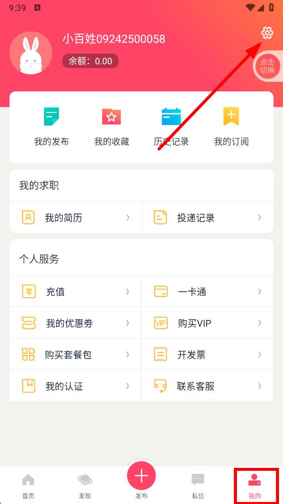 1、打开百姓网app,点击底部我的选项,在页面右上角,点击设置图标,进入设置界面。
