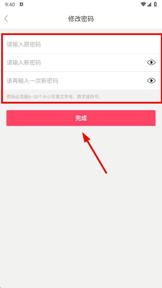 5、在修改密码页面,依次输入原密码、新密码、再次输入新密码进行确认,然后点击完成按钮,即可成功修改密码。
