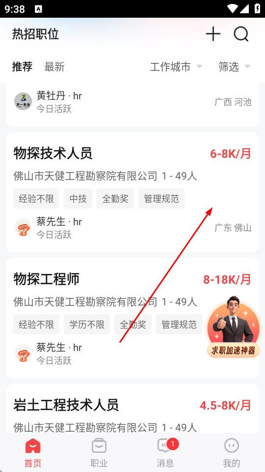 2、进入App首页,在热招职位中找到想要应聘的职位,点击进入职位详情页面。