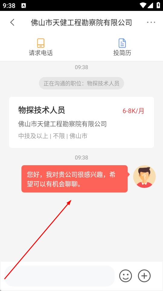 4、进入聊天界面后,会自动给招聘方发送打招呼语。