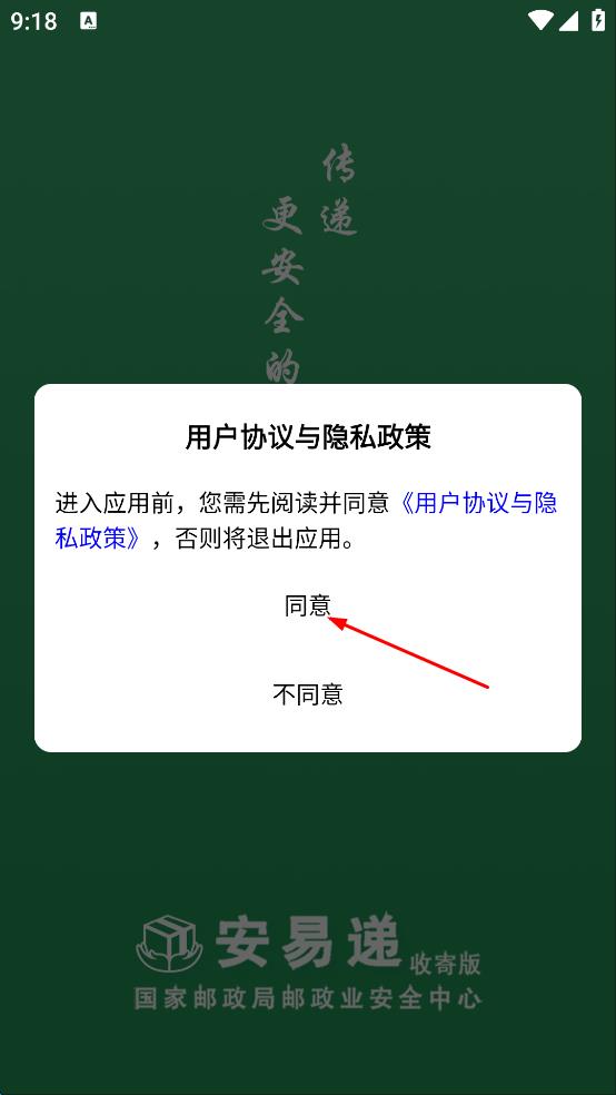 1、打开安易递收寄版应用,会弹出用户协议与隐私政策提示框,点击同意按钮,进入应用登录界面。