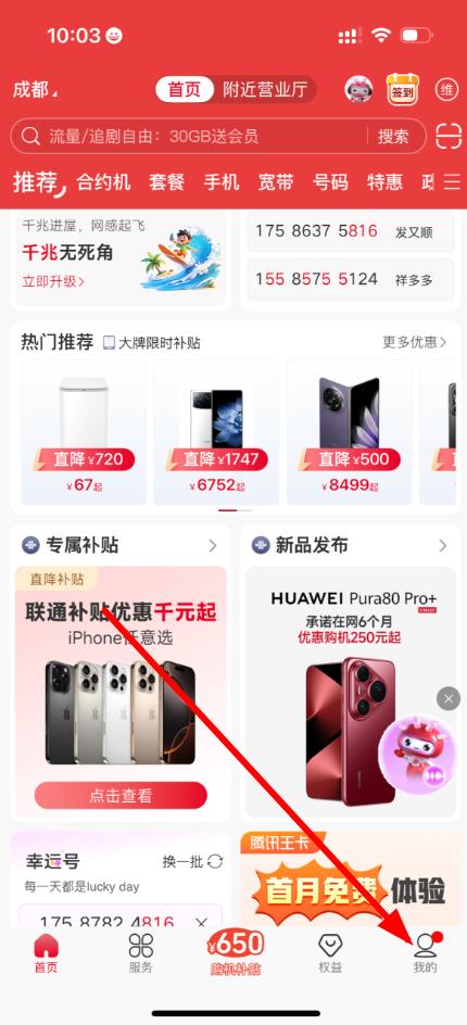 1、打开联通手机营业厅App,点击底部导航栏中的我的选项,进入个人界面。