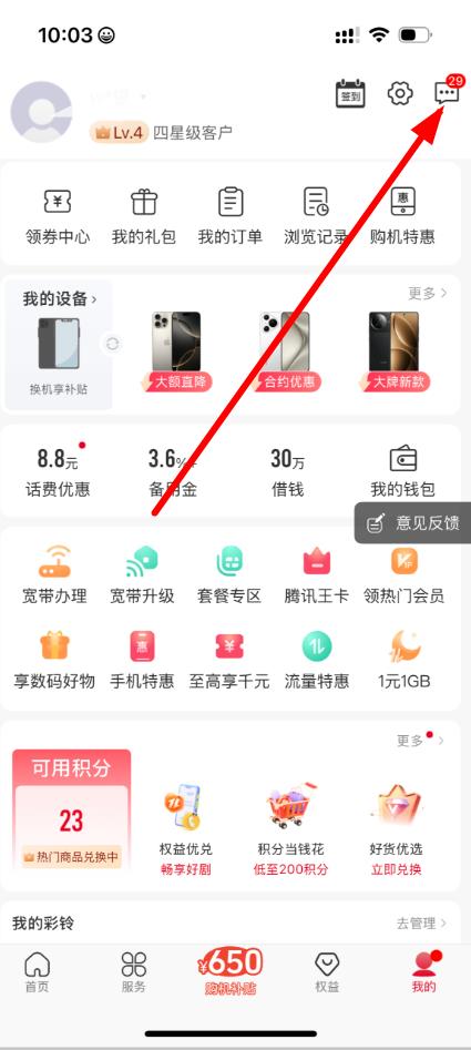 2、在个人界面中,点击右上角像对话气泡且带有数字提示的图标,进入消息。