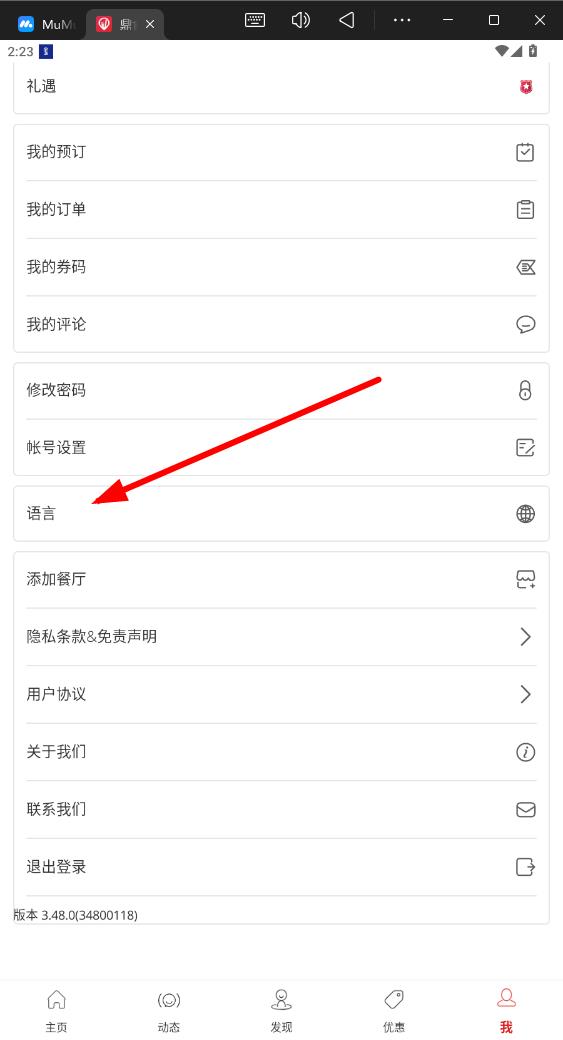 2、在个人页面中,向下滑动找到并点击语言选项。