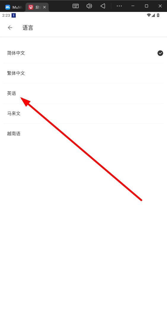 3、进入语言设置页面后,点击英语选项,即可将app语言切换为英文模式。