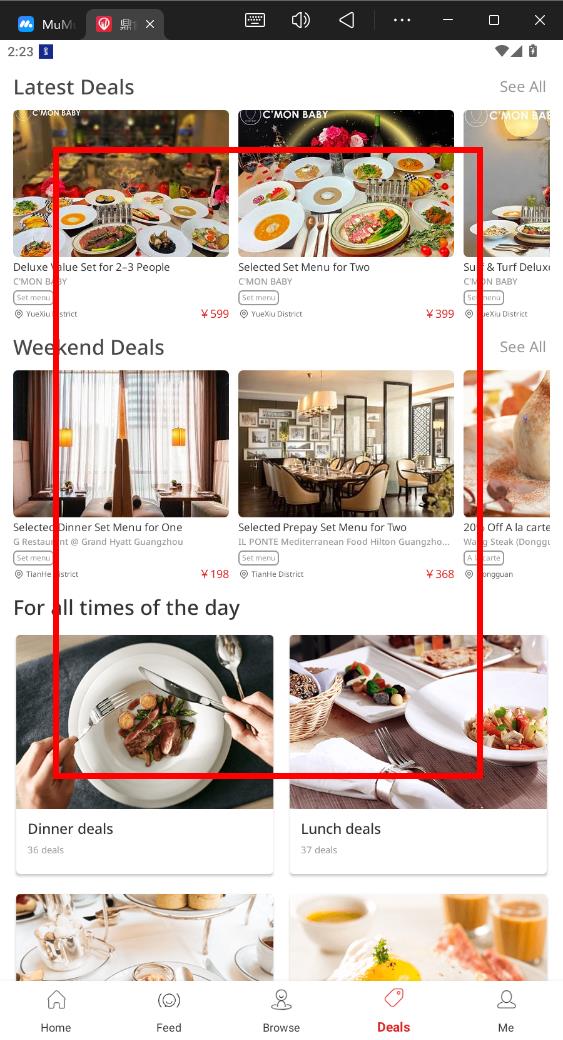 4、切换完成后,返回首页就能看到app界面语言变为英文,可浏览英文模式下的餐厅优惠等信息。