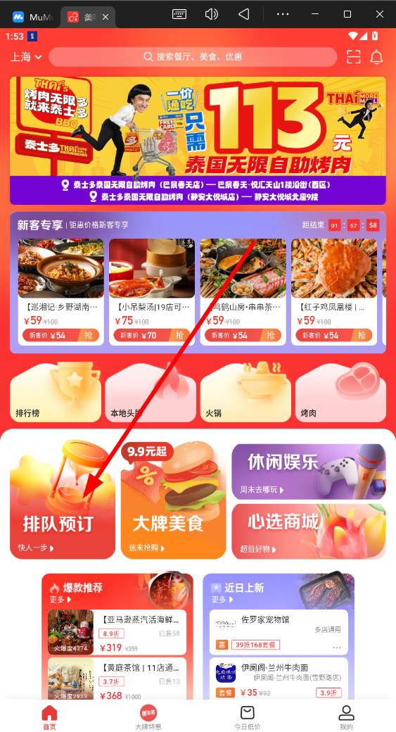 1、打开美味不用等app,在首页点击排队预订进入排队页面。