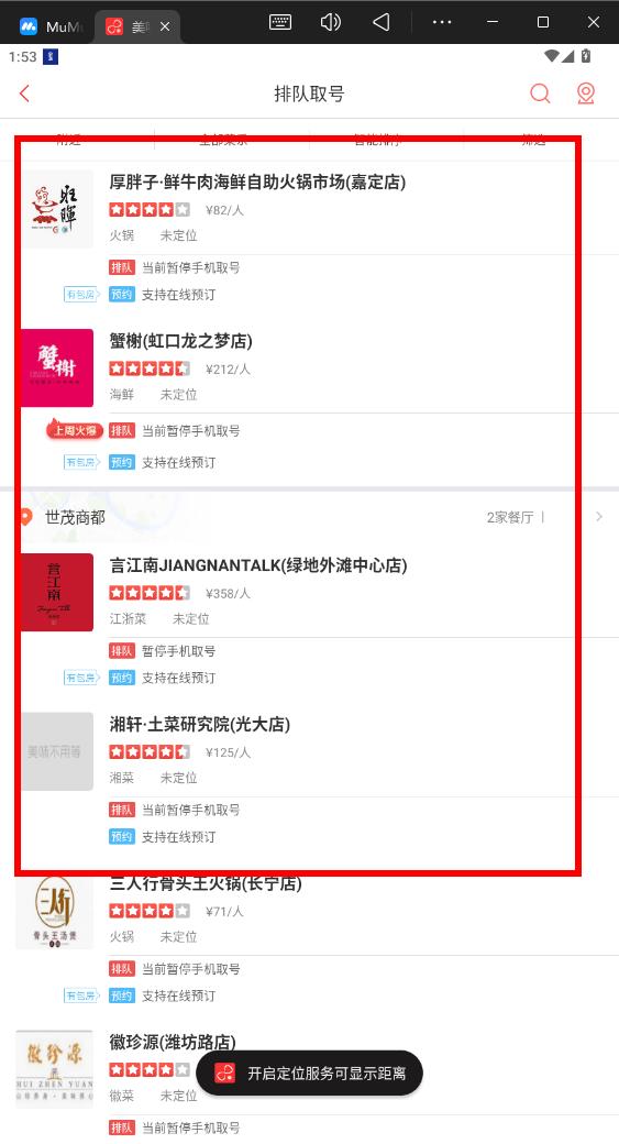 2、在排队取号页面浏览可选餐厅,选择想去的餐厅如厚胖子·鲜牛肉海鲜自助火锅市场(嘉定店)。