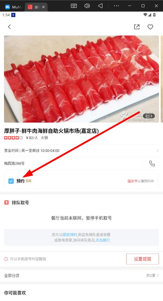 3、进入所选餐厅页面后,点击预约按钮,进行排队预约操作。