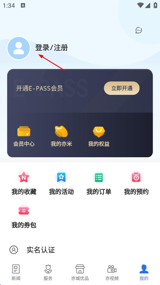 3、在个人中心页面上方,点击“登录/注册”字样,进入手机快捷登录界面。