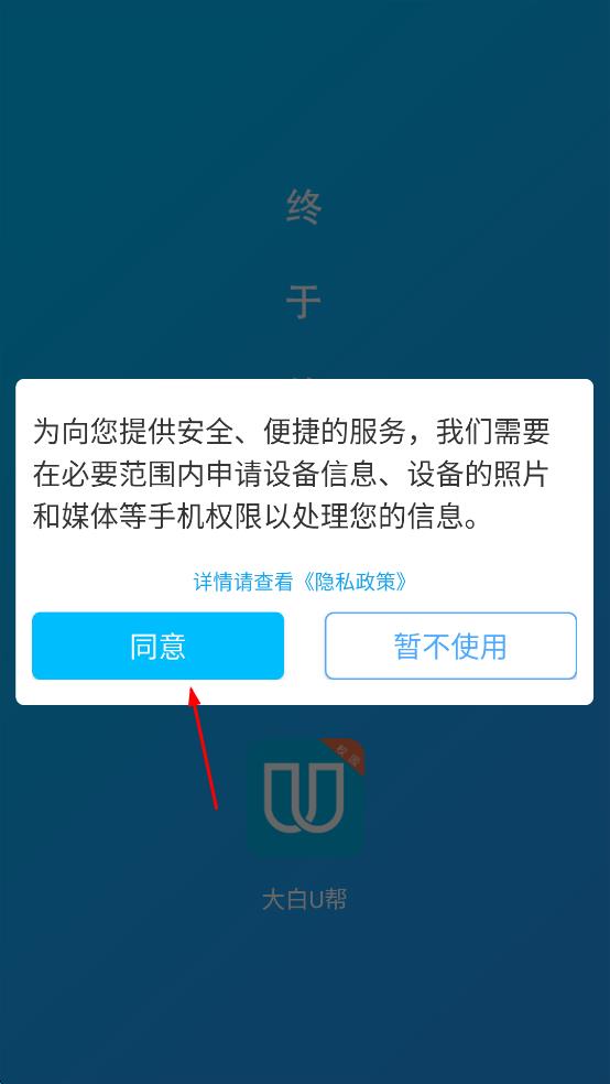 1、打开大白U帮软件,会弹出权限申请提示框,为了能享受安全、便捷的服务,点击“同意”按钮,进入登录界面。