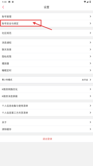 3、在设置页面,点击账号安全与绑定选项,进入账号安全页。