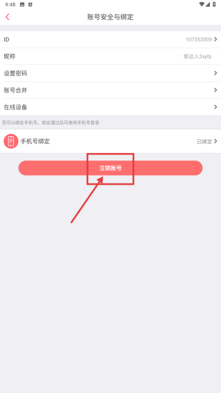 4、在账号安全与绑定页面,点击注销账号按钮,进行账号注销操作。