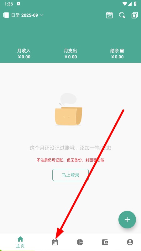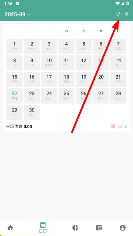 2、在日历页面,点击记一笔,进入记账分类选择页面。