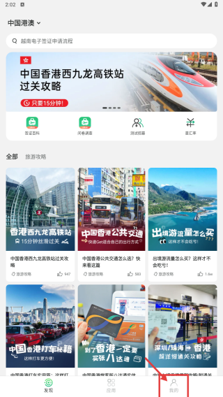 1、打开港澳出行攻略APP,点击底部我的选项,进入个人中心页面。