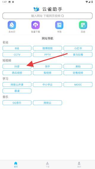 1、打开云雀视频下载器APP,在首页内点击抖音的图标。