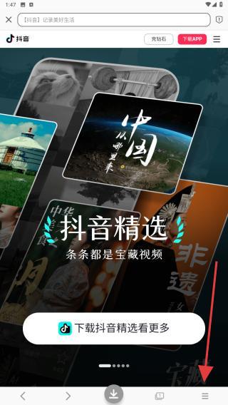 2、进入到抖音的网址页面内,点击右下角三个横线的图标。