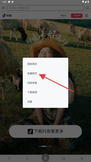 3、在弹出的菜单栏中,点击收藏网页的功能按钮。