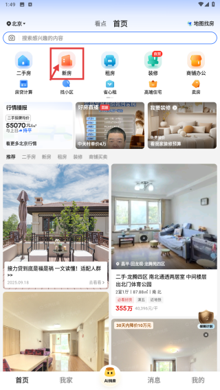 1、打开房产APP,点击首页新房选项,进入新房搜索页面。