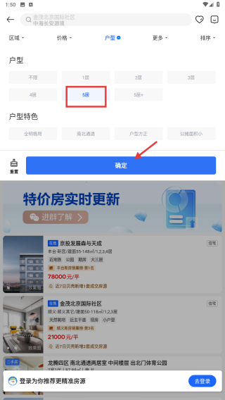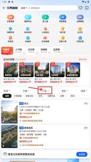 2、在新房页面,点击户型筛选条件,选择筛选。