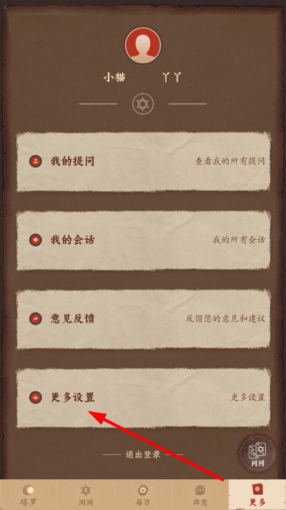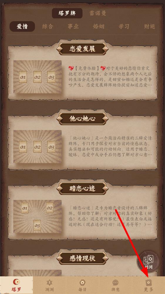 1、打开塔罗牌占星app,点击底部导航栏最右侧的更多图标,进入更多功能界面。