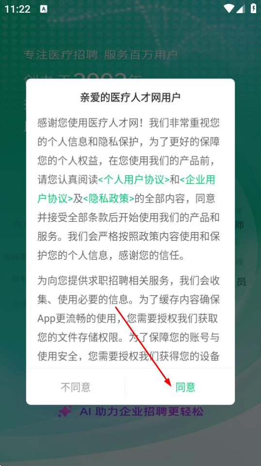 1、打开医疗人才网APP,在弹出的用户协议及隐私政策提示页面,点击同意。