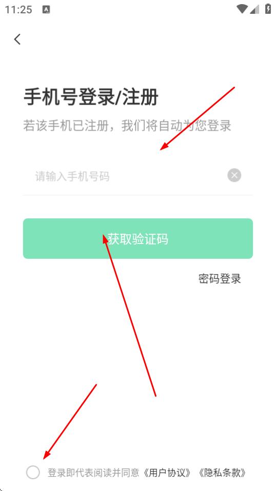 2、进入手机号登录/注册页面,输入手机号码,勾选登录即代表阅读并同意用户协议隐私条款,点击获取验证码。