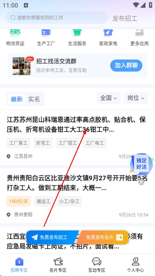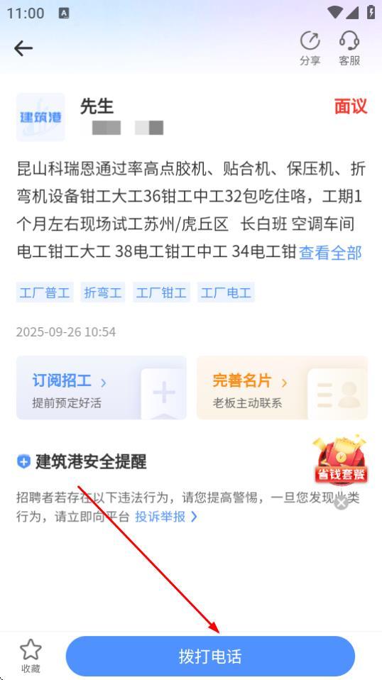 1、打开建筑港APP,在招聘专区找到感兴趣的招工信息并点击进入详情页。