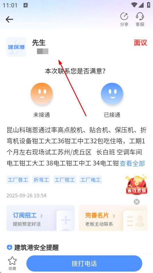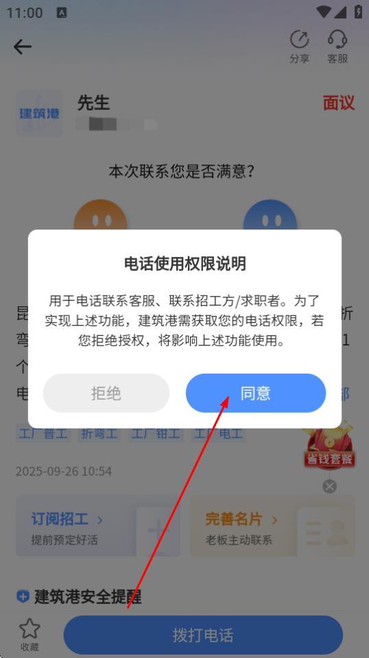 4、完成电话权限授权后,即可获取完整的招工方电话号码。
