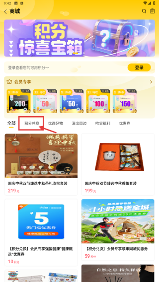 2、在商城页面,点击积分兑换分类,查看积分兑换商品。