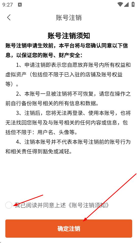 4、在账号注销页面,勾选我已阅读并同意上述账号注销须知,点击确定注销。
