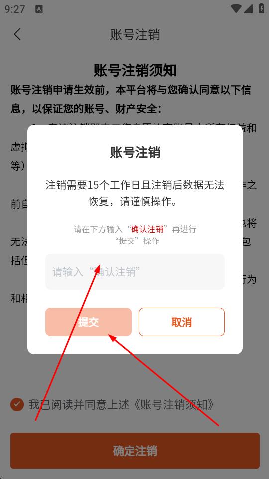 5、在弹出的账号注销窗口中,输入确认注销,点击提交,完成账号注销操作。