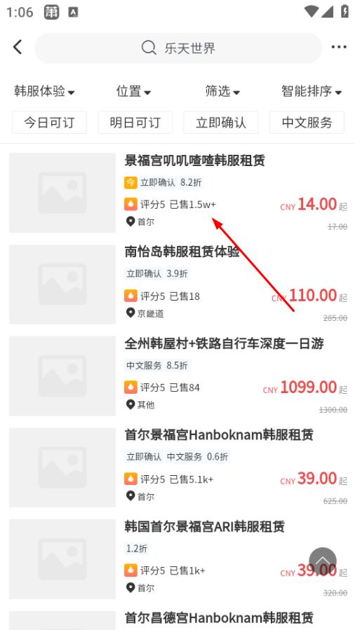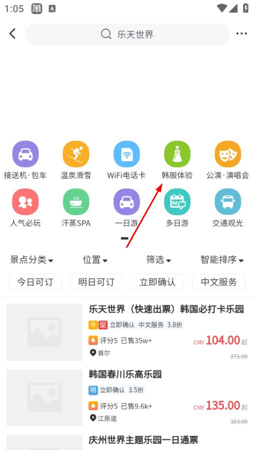 2、在景点门票分类页面,点击韩服体验,进入韩服体验项目列表页面。
