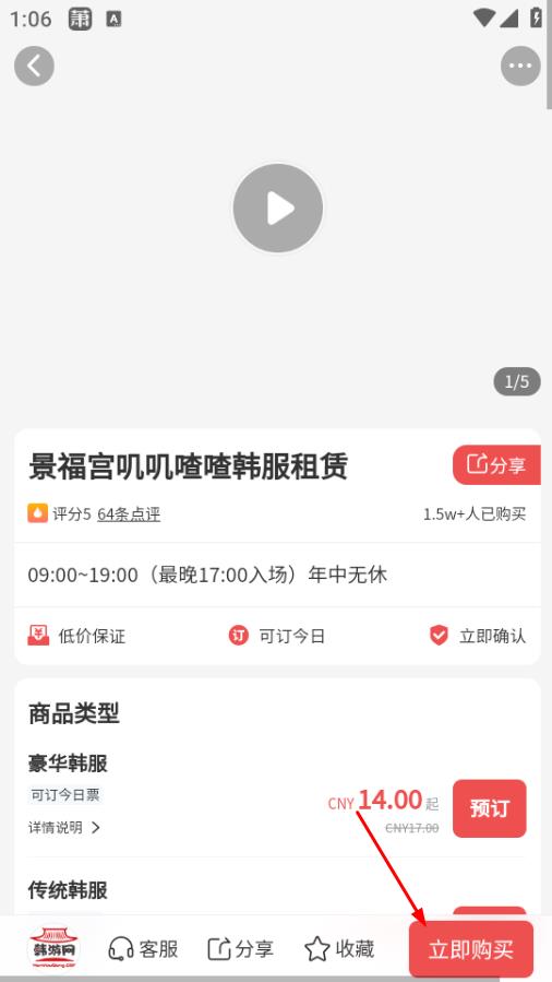 4、在项目详情页面,点击立即购买,进行韩服租赁购买操作。