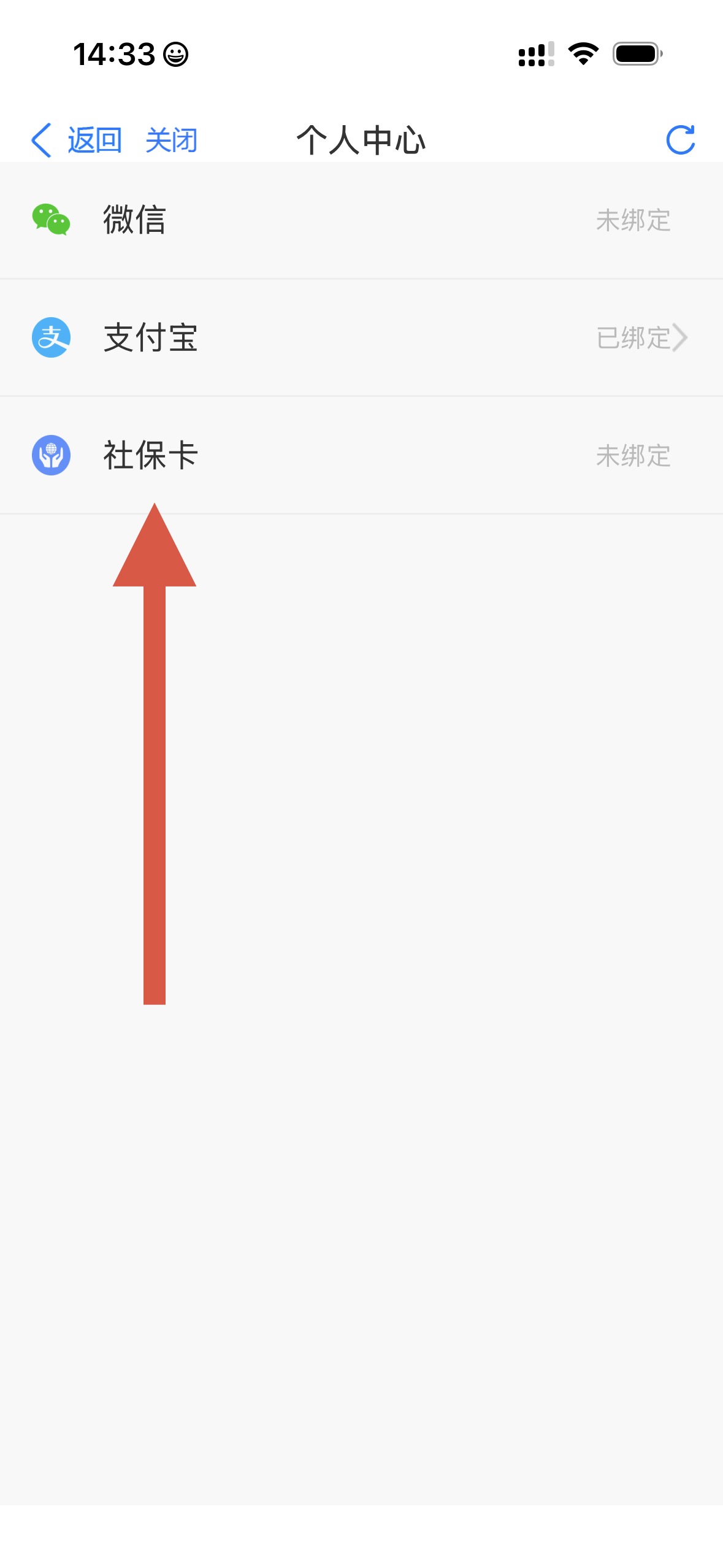 4、在账号绑定界面,找到社保卡选项并点击,按照提示完成社保卡绑定操作。