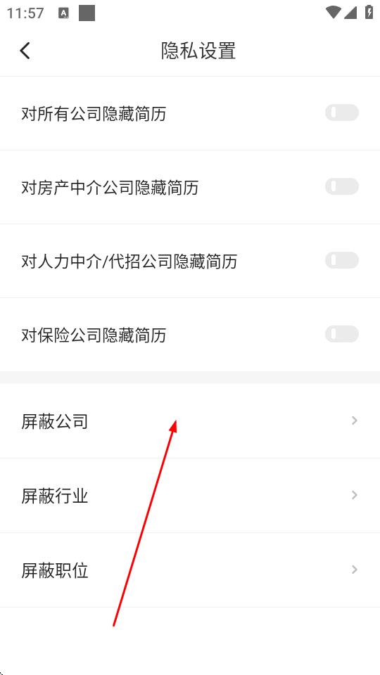 3、进入隐私设置页面后,点击屏蔽公司选项。