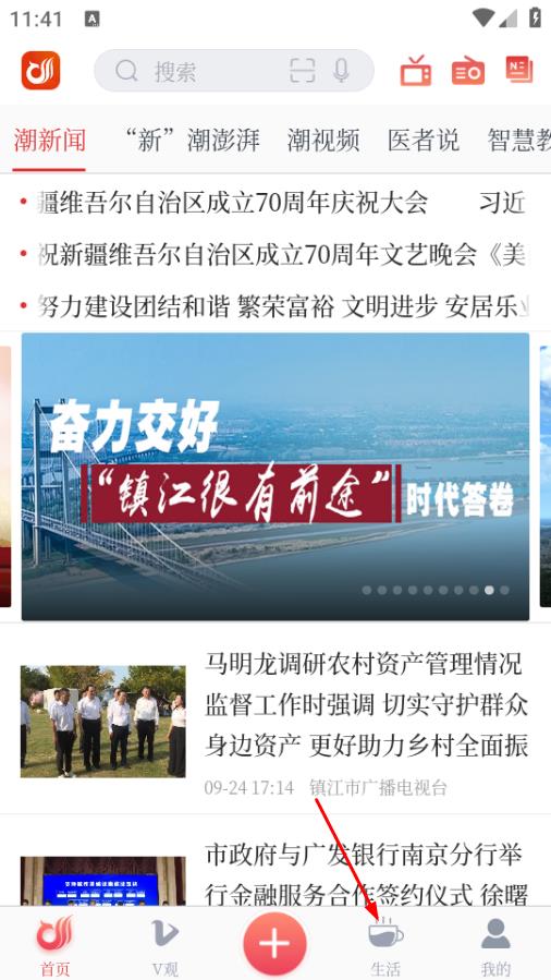 1、打开一起镇江,点击页面底部的生活,进入生活服务页面。