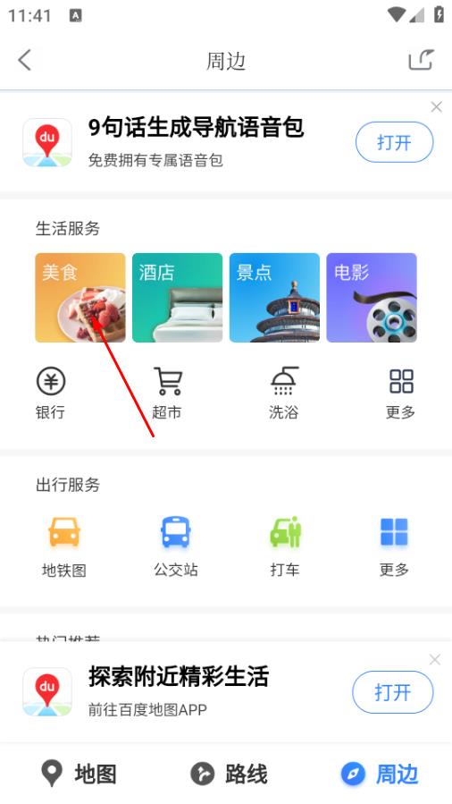 3、在周边服务页面,点击美食,进入美食推荐页面。