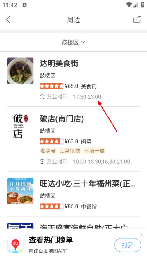 4、在美食推荐页面,可查看周边美食店铺信息,选择想去的店铺。