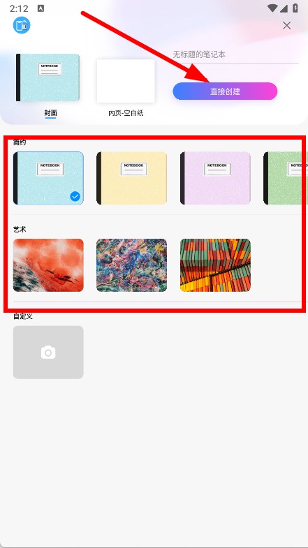 3、选择喜欢的笔记本封面样式,点击直接创建。
