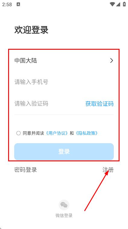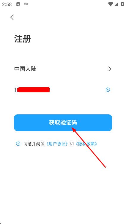 3、在注册页面,填写手机号后,点击获取验证码,获取注册验证码。