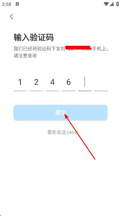 4、在输入验证码页面,输入收到的验证码后,点击提交,完成注册。