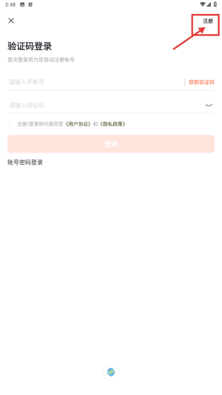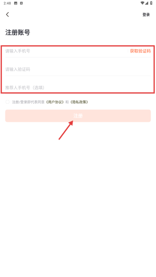 4、输入手机号码和验证码,点击注册按钮,完成账号注册操作。
