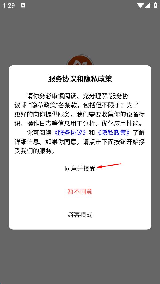 1、打开外卖类App,在服务协议和隐私政策页面,点击“同意并接受”按钮。