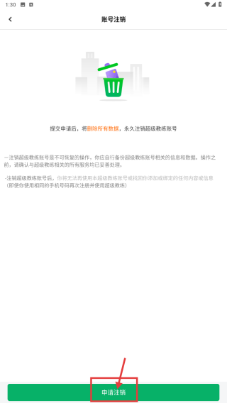 4、在账号注销页面,点击申请注销按钮,提交账号注销申请。